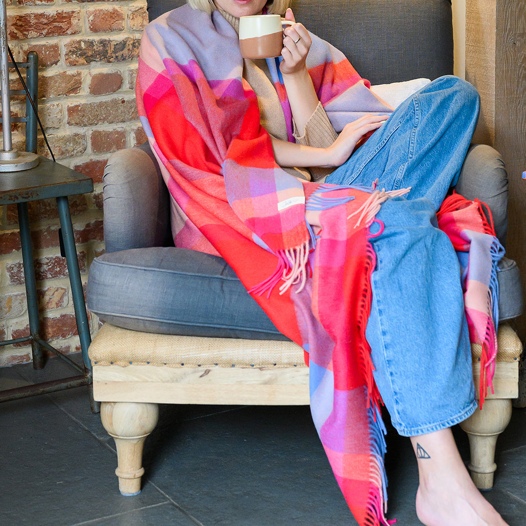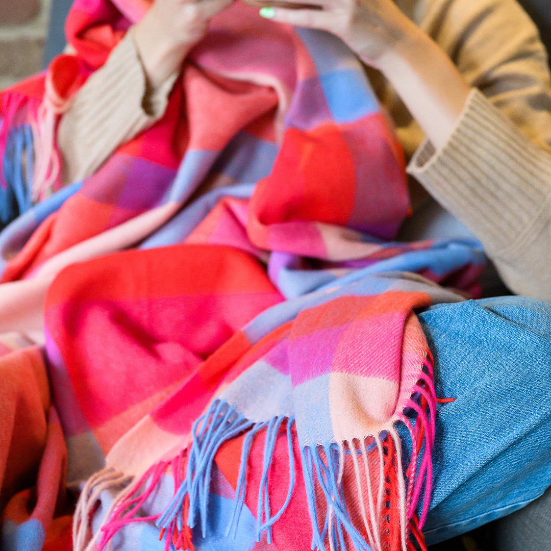Designed in our Southampton Studio and crafted from 100% pure Mongolian lambswool, this bold combination of red, fuchsia, sky blue, and soft blush turns your entire mood with one cosy embrace. While we know you’ll start liking the season because of this blanket, the Red Tartan Lambswool is made to last for generations, like a little legacy that you own.